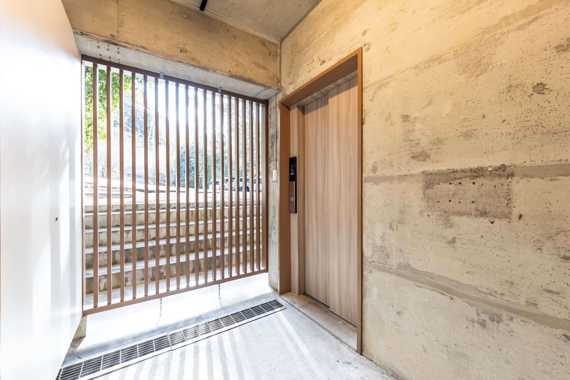 - ①玄関を出て、エレベーターで1階に降りていただき、不死王閣へと続く赤い桟橋を渡ってください。