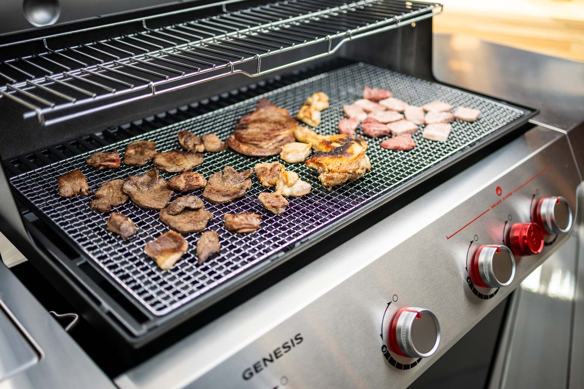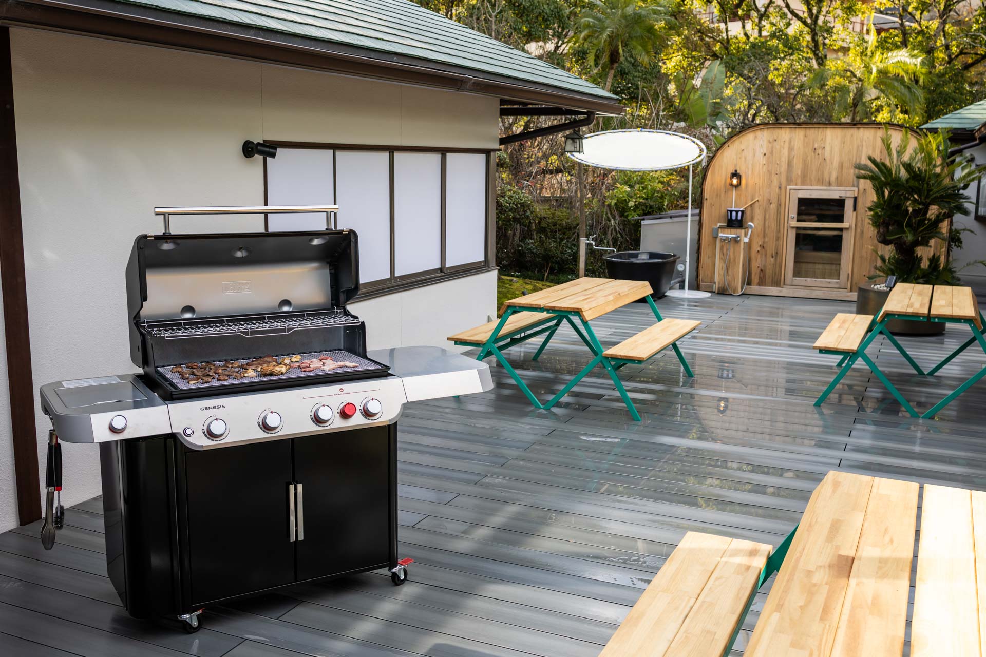 テラスでバーベキューに興じ、